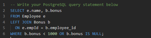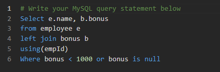 - or where the bonus is NULL (meaning they didn’t get any bonus)