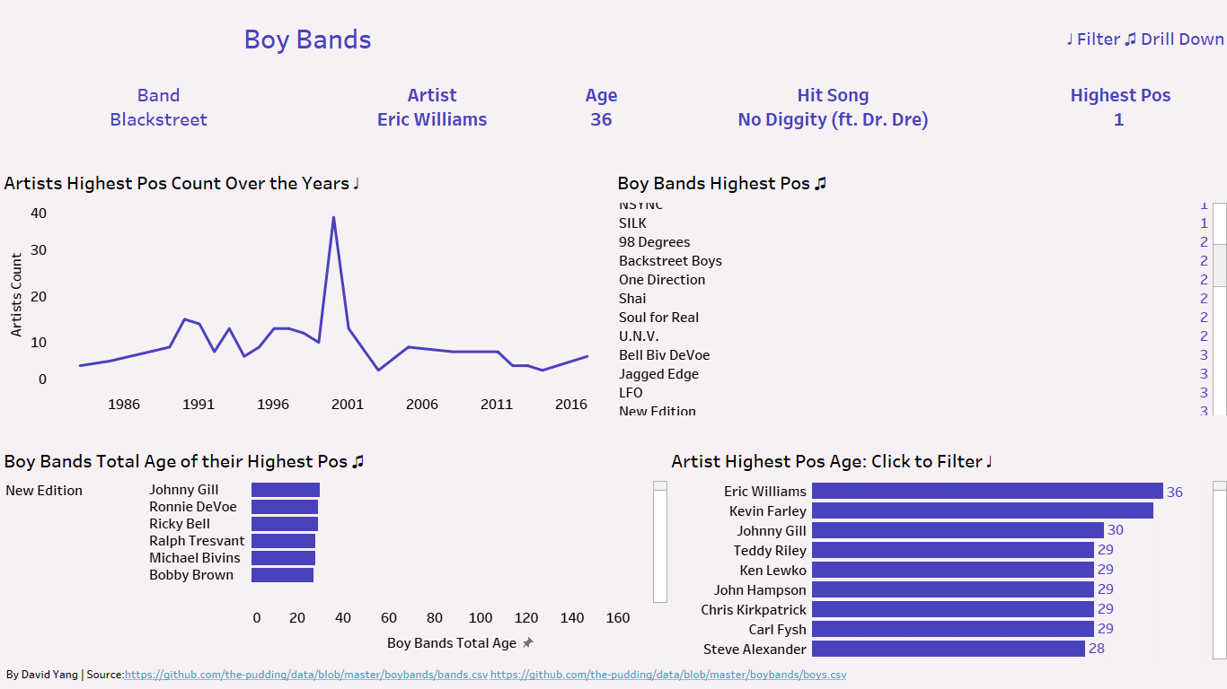 A sad day but also a happy day. Today was the last day of Dataschool Training. It was a joyous experience to go through all this together with 7 other people as well. Despite 4 months seemed like a relatively long time. It went by so Fast. From day one to the last day of it. Today the task was to make a dashboard on Boy Bands. It was an interesting experience to do a study and analysis on Boy Bands. My allocation of time to this project was stretched apart. The reason is because of my flight to Spain. All the planning and preparation for all of that. I keep it simple and here is my dashboard.