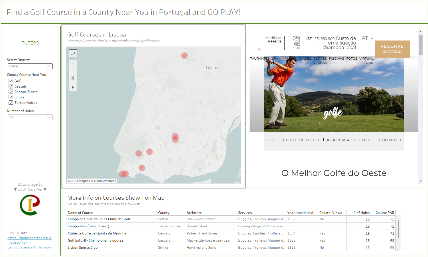 Today we were given a dataset that was completely in Portuguese. The dataset was on golf courses in portugal. It contained various different fields pertaining to indivdual golf courses such as the name of the course, where it is located, who was the architect, year it was built, etc. I immediately started off by translating all of the headers in alteryx to get a better idea of the data. Then figured out what one row of the dataset represented. After that I needed to start brainstorming ideas on what to create. My first thought was to have the user type in their city or town and have a buffer zone around them, which they would set as well. They would then see the golf courses around them, along with the distance away. You would then be able to select a course and the table would filter to that course. The website would generate on the dashboard for that selected course. I used alteryx to fix a few things on the dataset before it was tableau ready. The latitude and longitude needed to be split, a few words needed translation, and unused fields needed to be removed. I created a sketch for this and after completing it I began to build. I soon realized that I would need to supplement the data with towns and their coordinates if I wanted to have that point on the map and create the buffer and distances. I looked for a good amount of time for a dataset, but couldn't find one. The only data I found I would have to webscrape 20+ pages of data and realized I don't have the scope for that. I quickly pivoted for a more simplified version of the dashboard I wanted. My thought was I could use the data to help players find a course and book tee times. This became the dashboard I have completed for this project. For the dashboard I still used the map, table, and weblink. The dashboard allows the user to select a district and multiple counties and that filters the map and table. The table shows a more detailed description of the courses in view. The map allows the user to then select a course to view that courses website. The user can then click the image to be brought to a website to book the tee time. This I wanted to DZV in where the website was to book a tee time on the dashboard. I ran out of time and wasn't able to do this.