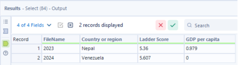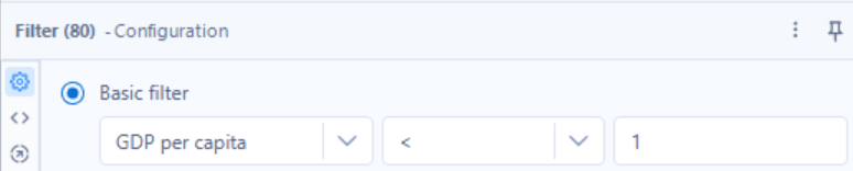 Using the output of the union from the previous question as our input here, the filter tool can be used to only include records where the ‘GDP per capita’ column is less than 1.