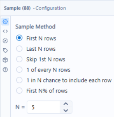 Lastly, as we only want to keep the top 5 countries with the highest average generosity factor over the 2-year period, the sample tool is used to keep the first N rows where N = 5.