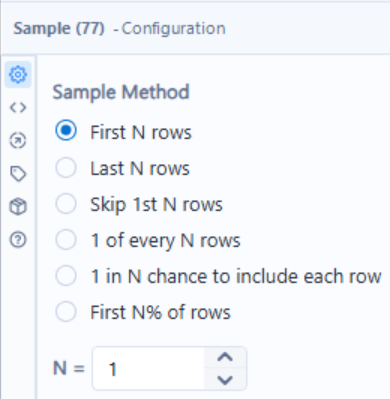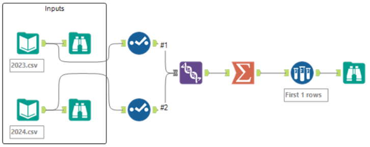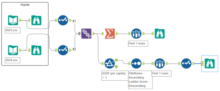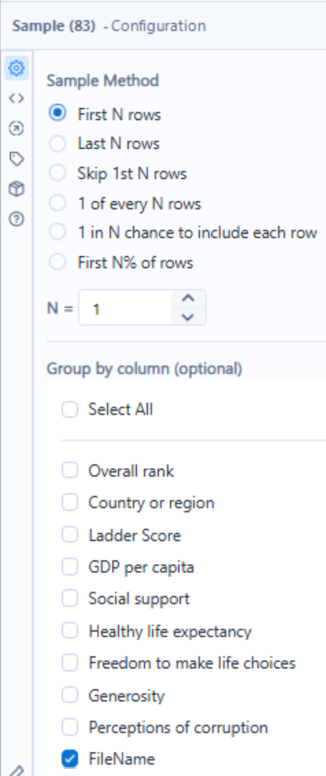 Now we only want to keep the first record that appears for each year, because this will be the country with the highest ladder score, given their GDP per capita value is under 1, for each year. This can be done using the sample tool again, keeping the first row grouped by FileName.