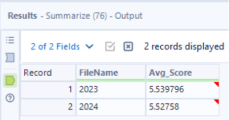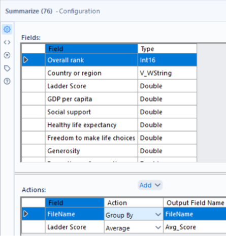 As we want the average happiness score for each year, the summarize tool is used to aggregate the data – grouping by ‘FileName’ and calculating the average ‘Ladder Score’.