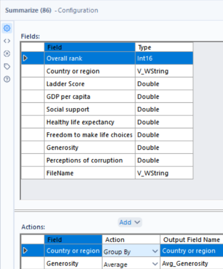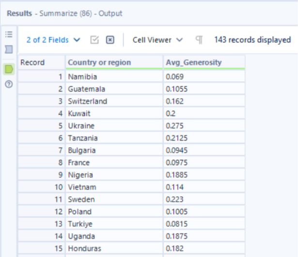 Again, using the output of the union as our input here, the summarize tool can be used to aggregate the data and calculate the average generosity fact over the 2-year period for each country.