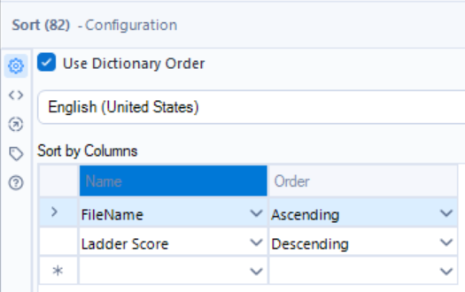 This is followed by the sort tool, where for each year we want to sort the records by their Ladder Score value, from highest to lowest. So, ‘Filename’ will be sorted with ascending order first (for ‘Filename’ it doesn’t matter whether the sort order is ascending/descending), then ‘Ladder Score’ will be sorted in descending order.