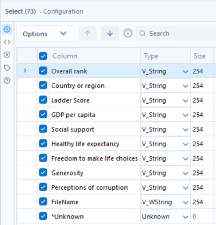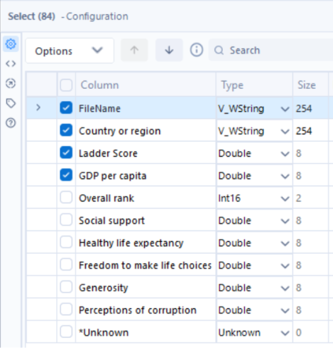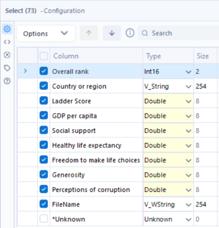 Using this on the 2023 dataset, we can spot many mistakes. From a quick look at the data, we see that ‘Overall rank’ contains whole numbers and the ‘Ladder Score’ alongside the six variables following it are decimals, however currently they are all classed as strings. Let’s change this, for ‘Overall rank’ select Int16, and for Ladder Score and the six remaining variables select Double. Lastly, untick the ‘*Unknown’ column, as this is not needed here.