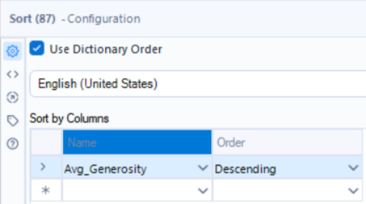 To then sort the records by their average generosity factor, from highest to lowest, the sort tool can be used where the order for ‘Avg_Generosity’ is set to descending.