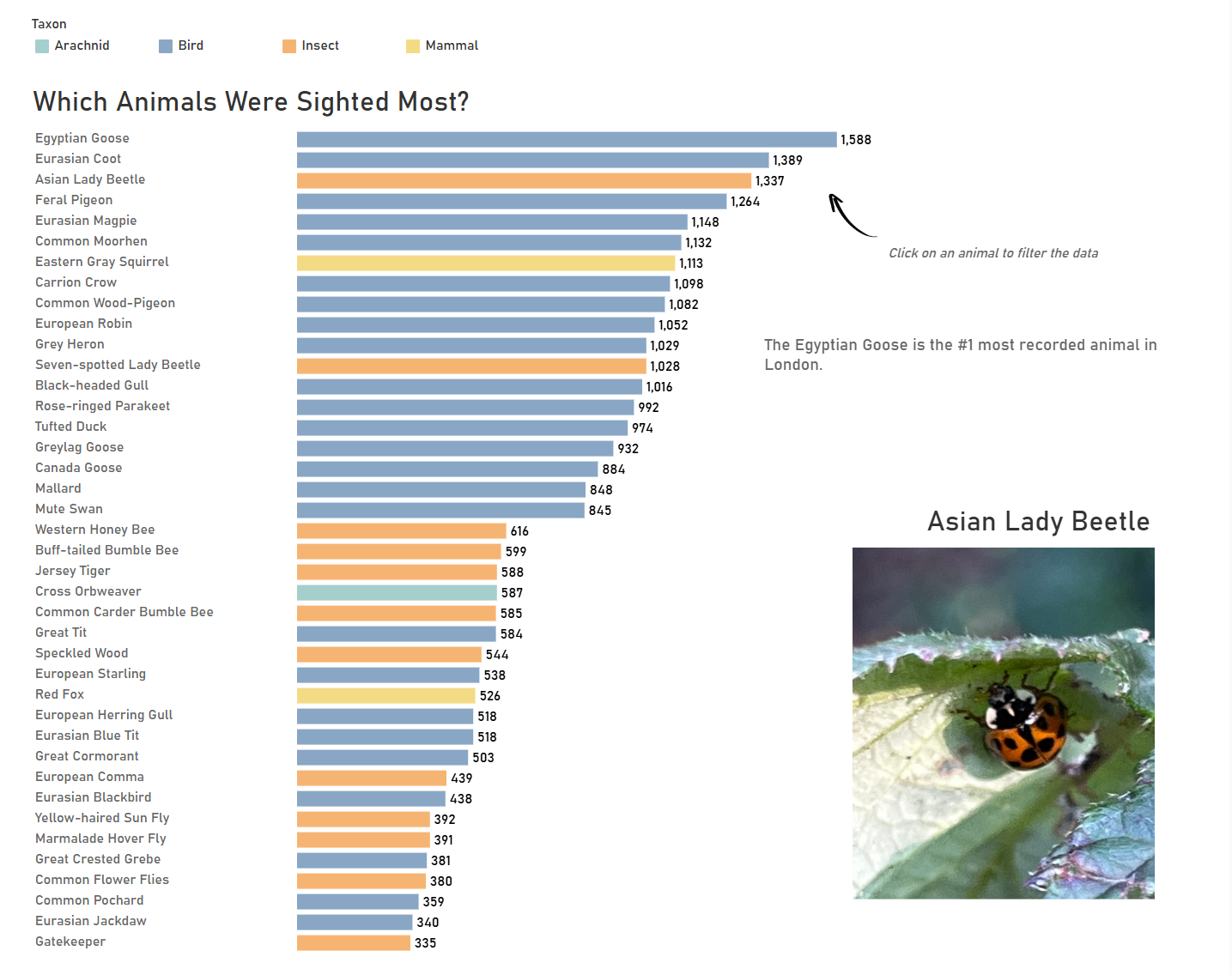 For my latest Tableau dashboard, I sourced data from a platform called iNaturalist, where users upload images and observations of wildlife they encounter. To keep the dataset manageable, I filtered the records to include only observations from London between 2024 and 2025.