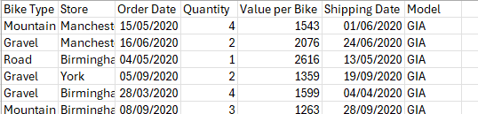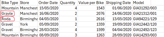 Let’s look at the following dataset. We can see that the ‘Bike Type’ field contains misspellings such as ‘Roda’ instead of ‘Road’ and ‘Gravle’ instead of ‘Gravel’.