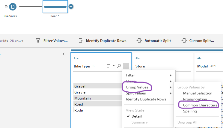 Once the csv file is loaded onto Prep Builder, we have the option to clean the typos by adding a clean step and grouping values based on common characters.