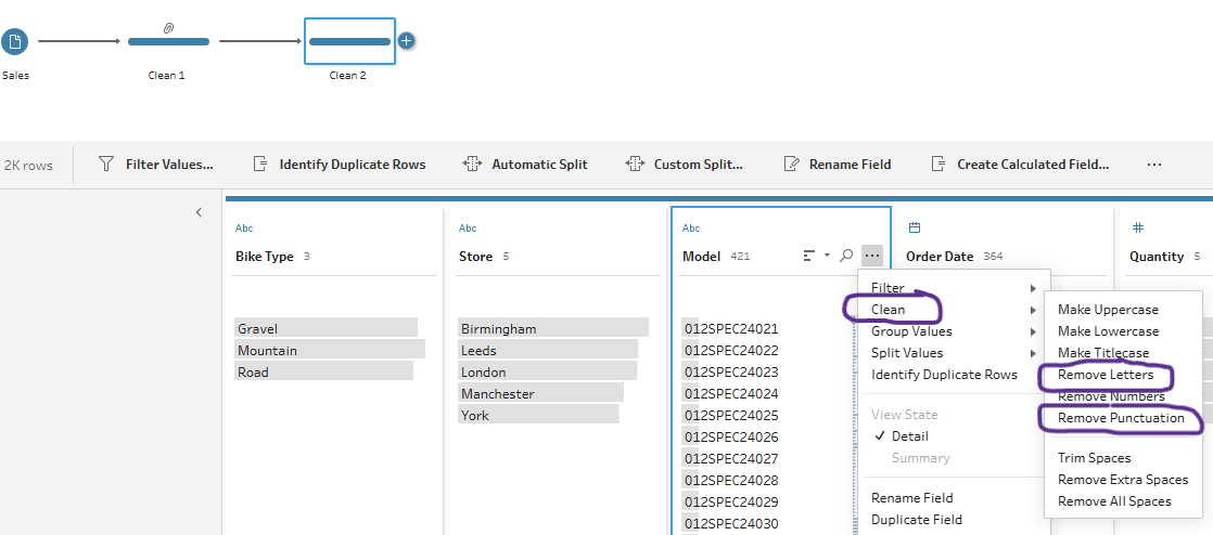 Then, if we were interested only in the brand of the bikes we could also add another clean step to remove letters and punctuation from each model.