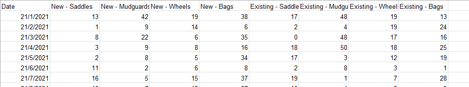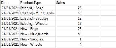 Let’s look at the following data. There are multiple data fields that have similar characteristics like ‘New-’ and ‘Existing-’. These can be pivoted into rows so that each row represents a single observation (Date + Product Type), which makes it easier to filter, aggregate, or visualize.
