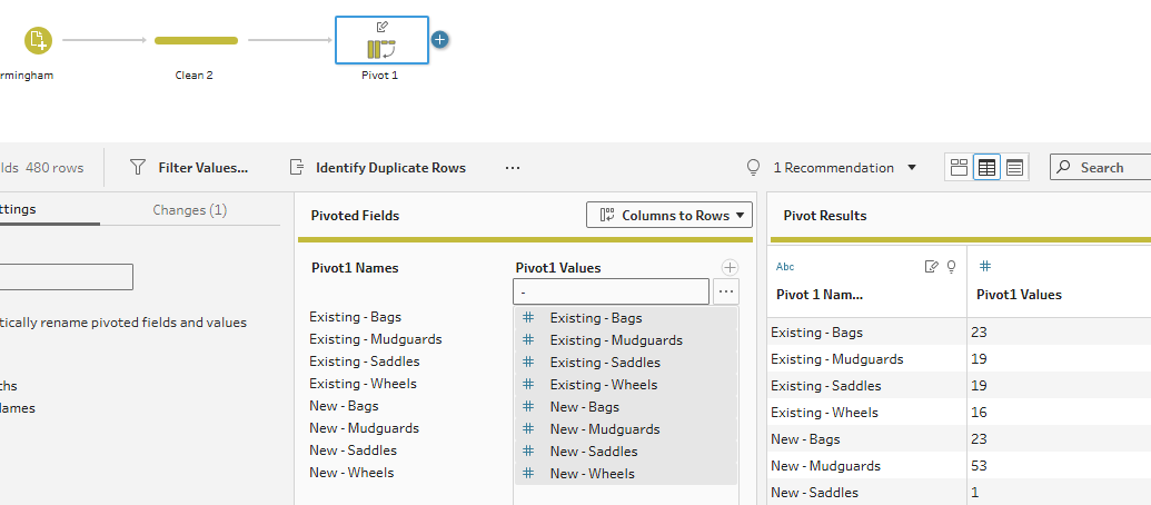 To achieve this, in Prep Builder you can pivot the Columns → Rows using the wildcard search based on the ‘-’ between ‘New’ and ‘Saddles’.