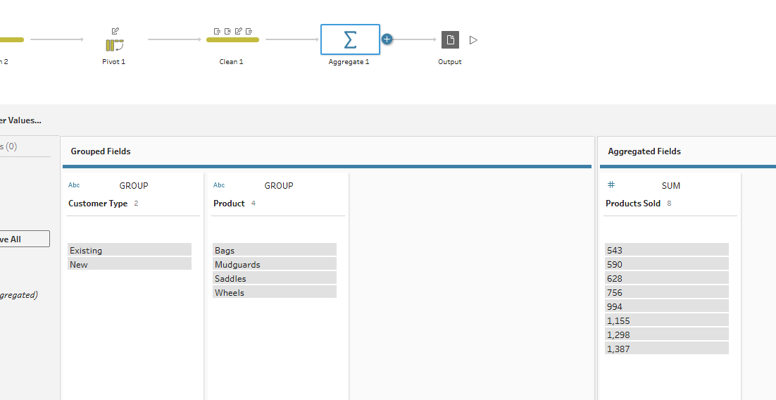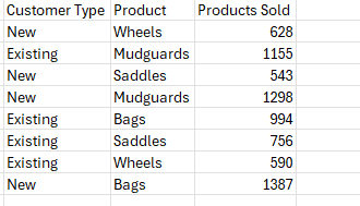 Using the same data as above, we can achieve this by dragging Customer Type and Product fields into the Grouped Fields section. Then, drag the Products Sold field into the Aggregated Field.