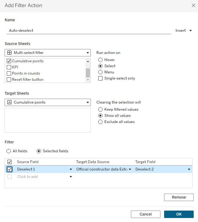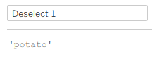 To explain how this works, essentially you're using a filter to say when I perform my selection, I want to filter my 'deselect 1' field to equal my 'deselect 2' field in the line chart. But potato can never be equal to tomato so it automatically clears the selection to show all values. However, as in our other parameter actions we have set them to keep the current value, the boundaries remain the same even when deselected.