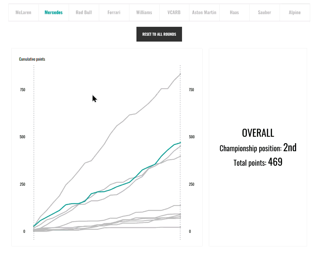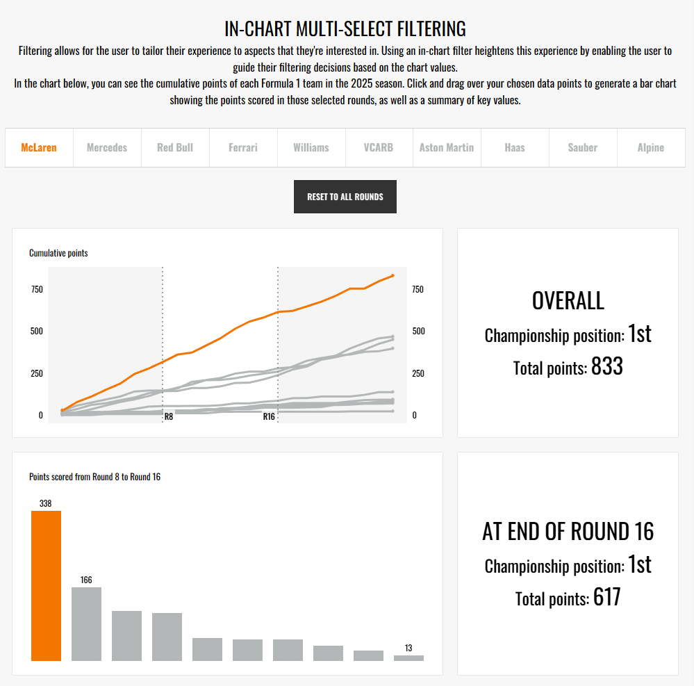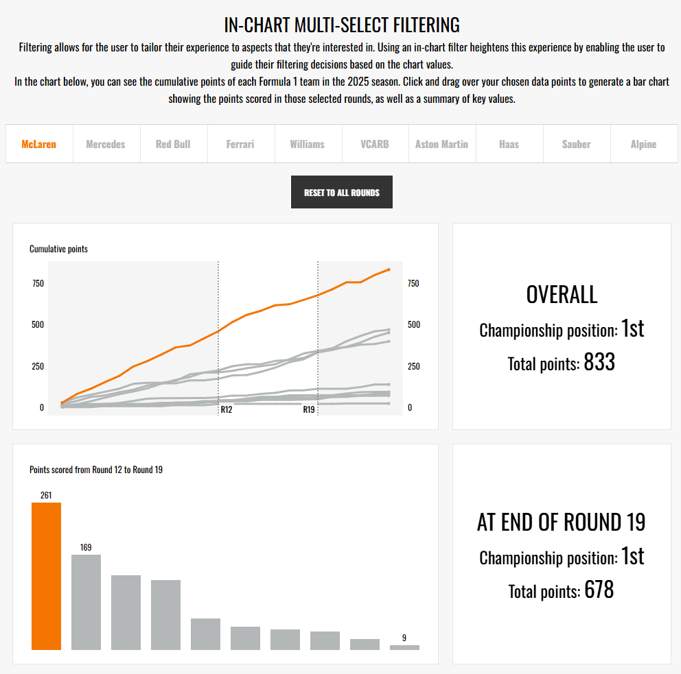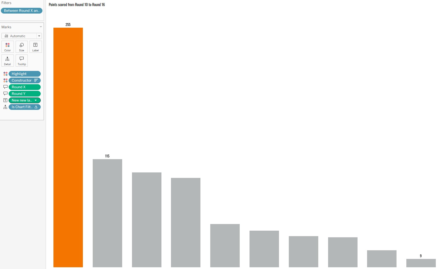To create the chart filter, you first need to understand the logic behind what you're creating. With the click and drag action, the user is highlighting an area of the chart that they want to know more about. They might want to know the profit made across different categories in that specific timeframe for example. In my visualisation, the user can explore the points scored by each constructor across the chosen rounds using a bar chart that more clearly represents and compares those values.