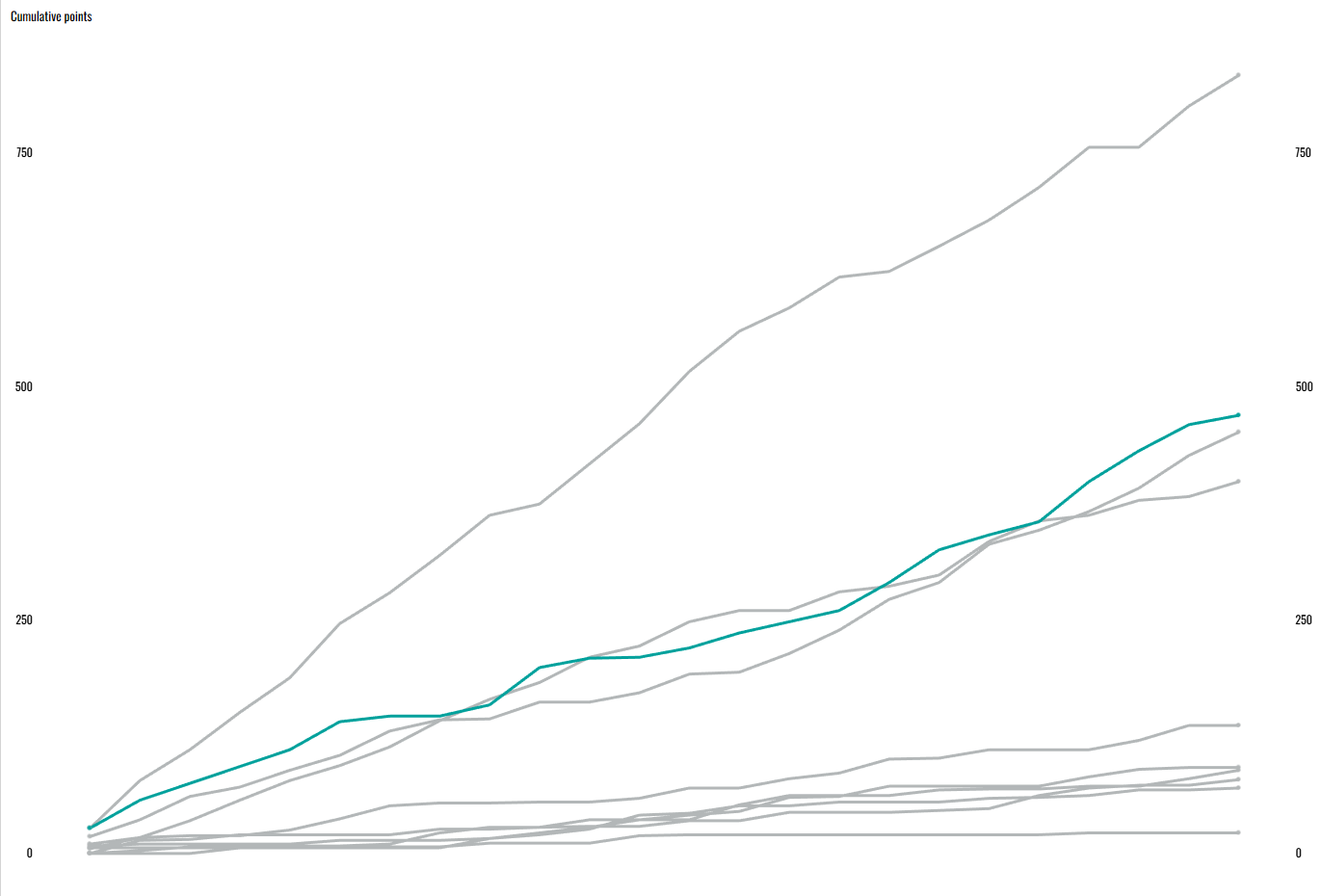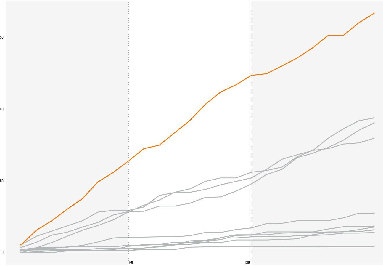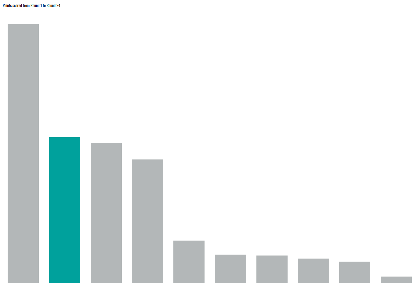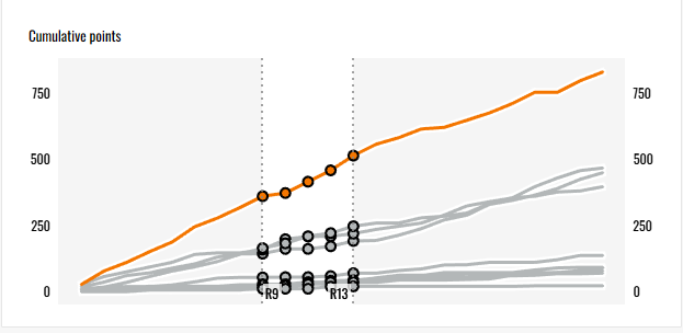 In the example above, the minimum boundary is round 8 and the maximum boundary is round 16 and we want to see the points scored between rounds 8 and 16 inclusive. As a result our calculation looks as follows: