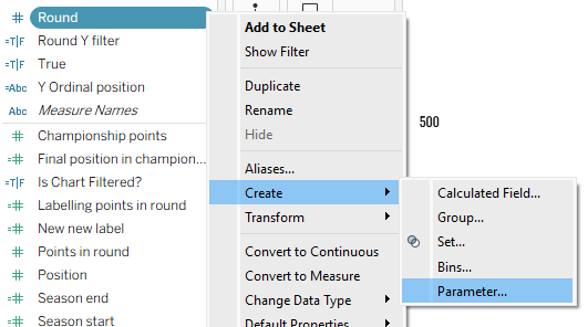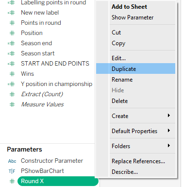 To form the click and drag action, you'll need two parameters to define the boundaries of the filter. These parameters are based on your x axis measure so head to where that is in your data pane and start by creating your first parameter.