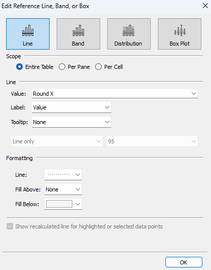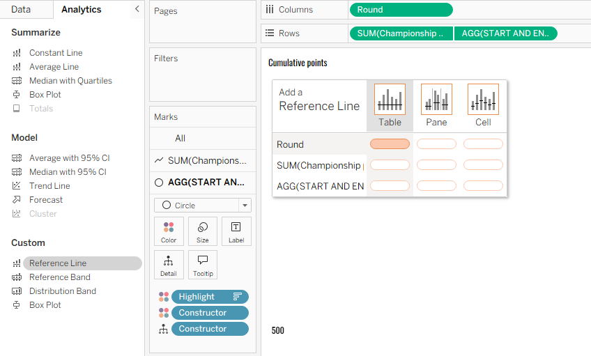 To add your reference lines, go to the analytics pane and drag a reference line onto the canvas. You want it to be on your x axis measure that's setting the timeline (for me, that's round) and on the table section.
