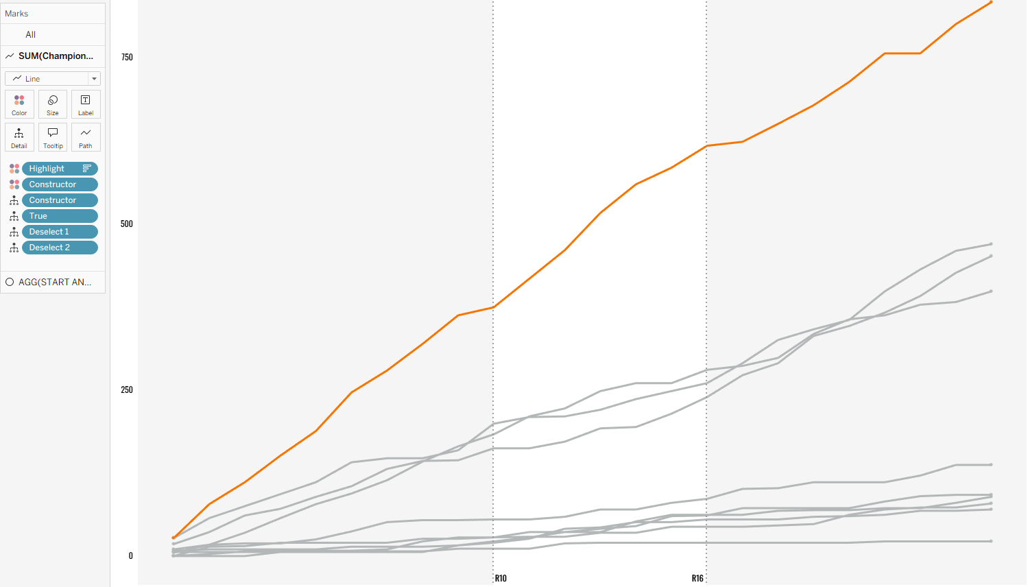 Let's start by at least attempting to explain what's going on though. I call this manoeuvre the 'click and drag' because that's what the user does to select the timeframe that they want to filter to. This filter creates a range which can then be applied to other charts, as I do in the demonstration below. Of note, the 'timeframe' does not just have to be the traditional dates timeline. The filter action is only applicable to line charts but as long as you have a time-like element that's appropriate for the sequential nature of a line chart, you can use whatever measure you'd like. In my example, I'm using the rounds in Formula 1 and if you are thinking about moving away from the classic date format, sports provide an excellent backdrop as they usually have their own timeline like matchdays or tournament stages. But a classic is a classic for a reason so don't shy away from using this action with a line chart using dates either - it will really elevate the user experience to change your regular dashboard into something special!