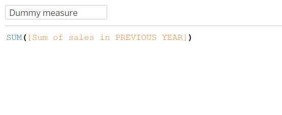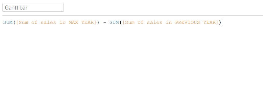 Step 2: Create a dummy measure for where your Gantt bar starts. To get your Gantt bar to start at the end of the previous year sales bar, rather than at zero on the axis like a normal bar would, you need to create a dummy measure. By setting the dummy measure to be your sum of sales in the previous year, this is the perfect fix to get your Gantt bar to start where you want it to, sort of like setting sum of sales as zero on the Gantt axis.