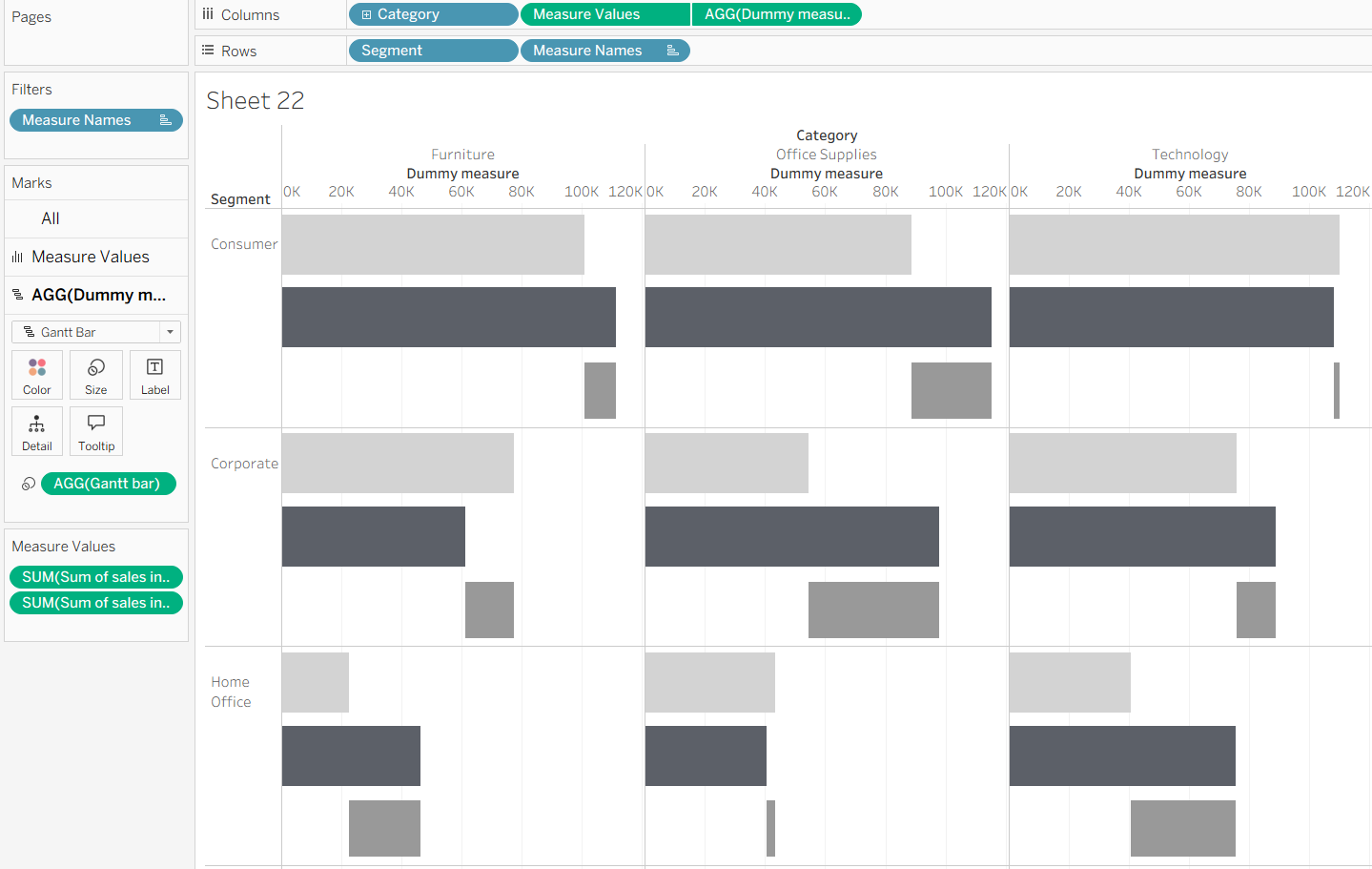 Step 3: Put these calculations into your current chart. Add your dummy measure onto the columns shelf and change the mark type to Gantt bar. Then add your Gantt bar calculation onto size. Make sure that you're doing this in the marks card specific to your dummy measure, otherwise you'll run into trouble quite quickly!