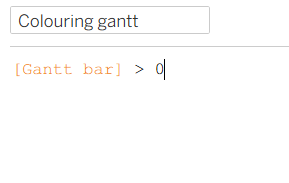 Step 4: Colouring your Gantt bars. Again, a rather simple calculation using a Boolean where if the Gantt bar calculation is greater than zero, it is therefore assigned the true value whilst the false value is given to anything equalling or less than zero. Each value has its own colour. Drag this calculation onto colour on your marks card.