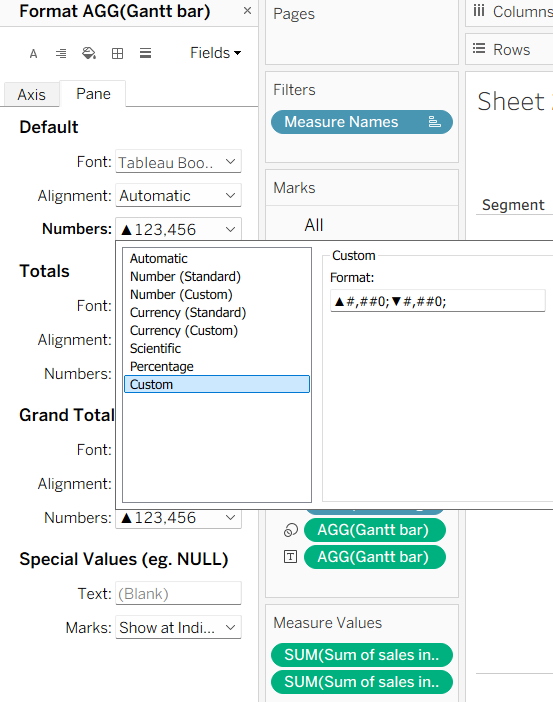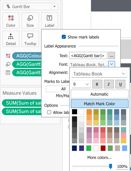 Step 5: Labelling your Gantt bars. Drag your Gantt bar calculation onto labels on the marks card. You then need to do some formatting tricks to get it to match the way that it looks in the feature image. To add the triangles, right click on your Gantt pill and select format. Write in a custom number format with the same layout as below.
