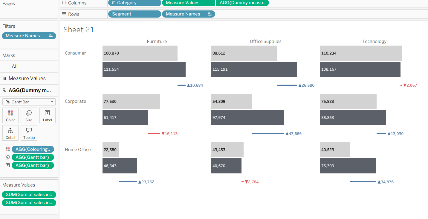You've created an excellent small multiples chart which shows the difference in sales between your current and previous year across multiple categories and segments, but it's missing that extra something. That's where your coloured Gantt comes in; a fantastic way to visually demonstrate the significance of the difference between the two years, with colour and triangular formatting highlighting whether these difference lines are positive or negative (Did I use the semi colon correctly? I'll never know). The chart couldn't be more show, don't tell. To anyone who hasn't joined from my other blog post, this is a two parter (double the fun!) based on an old Workout Wednesday that we were challenged with in training. Head on over to the first part if you want to see how to create the basic small multiples chart and then return to learn how to create that something special with the Gantt bars. If everyone is now ready and in the right place, let's get started!