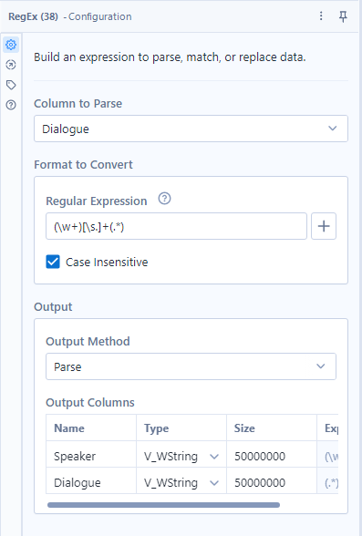 To separate the name and line, I had to translate that into regular expression terms: (\w+)[\s.]+(.*). Regular expressions are pretty much illegible at a glance, so I will take the time to break this one down! For this use case, I used the "Parse" output method in the Alteryx RegEx tool, which requires parentheses around each capture group, or subsection of the string that I want to be returned as its own column.