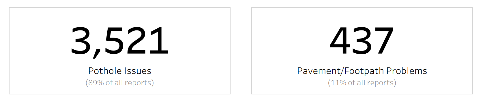 Other BANs would break the overall count into the two separate categories: Number of Reported Potholes and Number of Reported Pavement/Footpath Issues (Definitely not in those exact words as that would be quite repetitive and frowned upon).