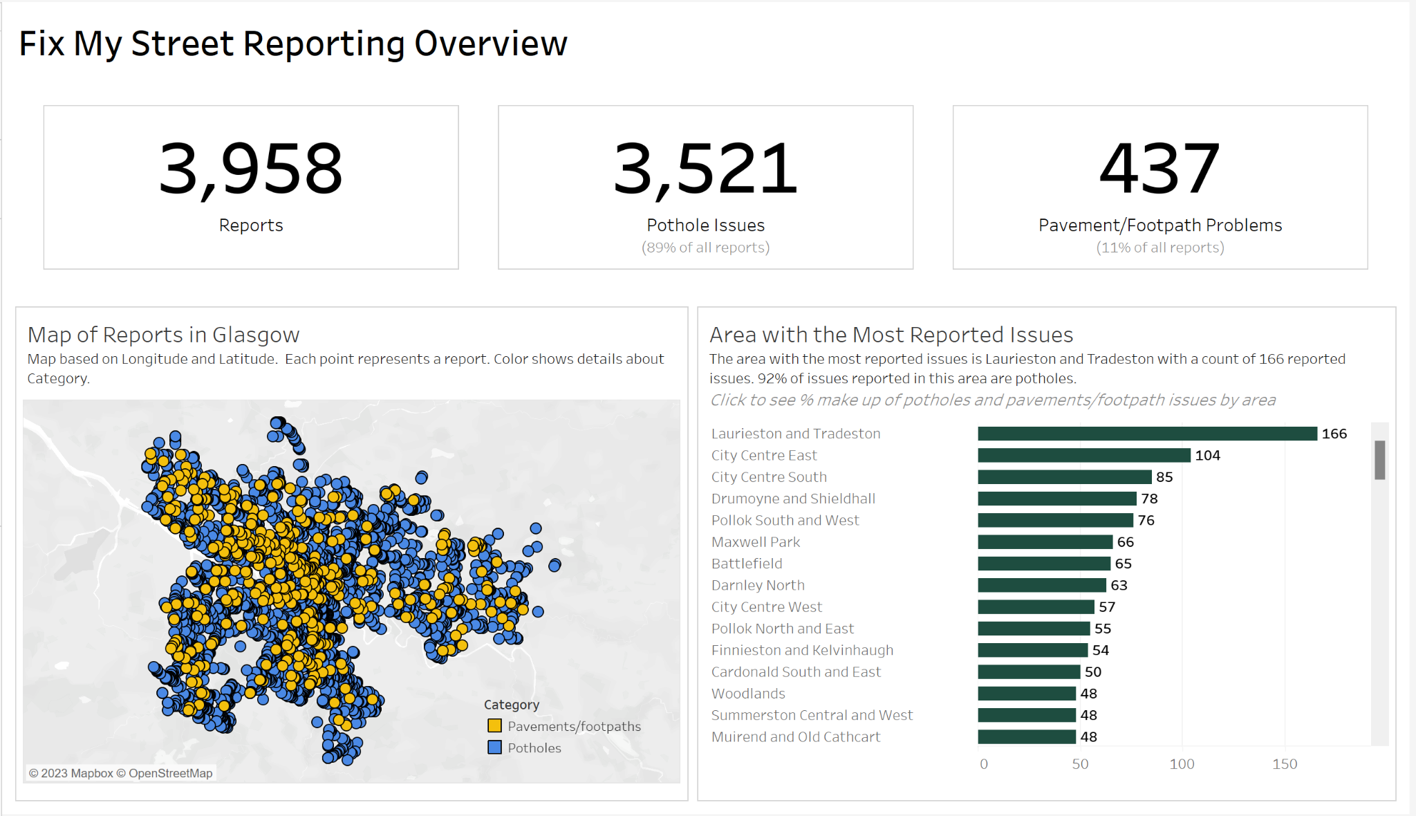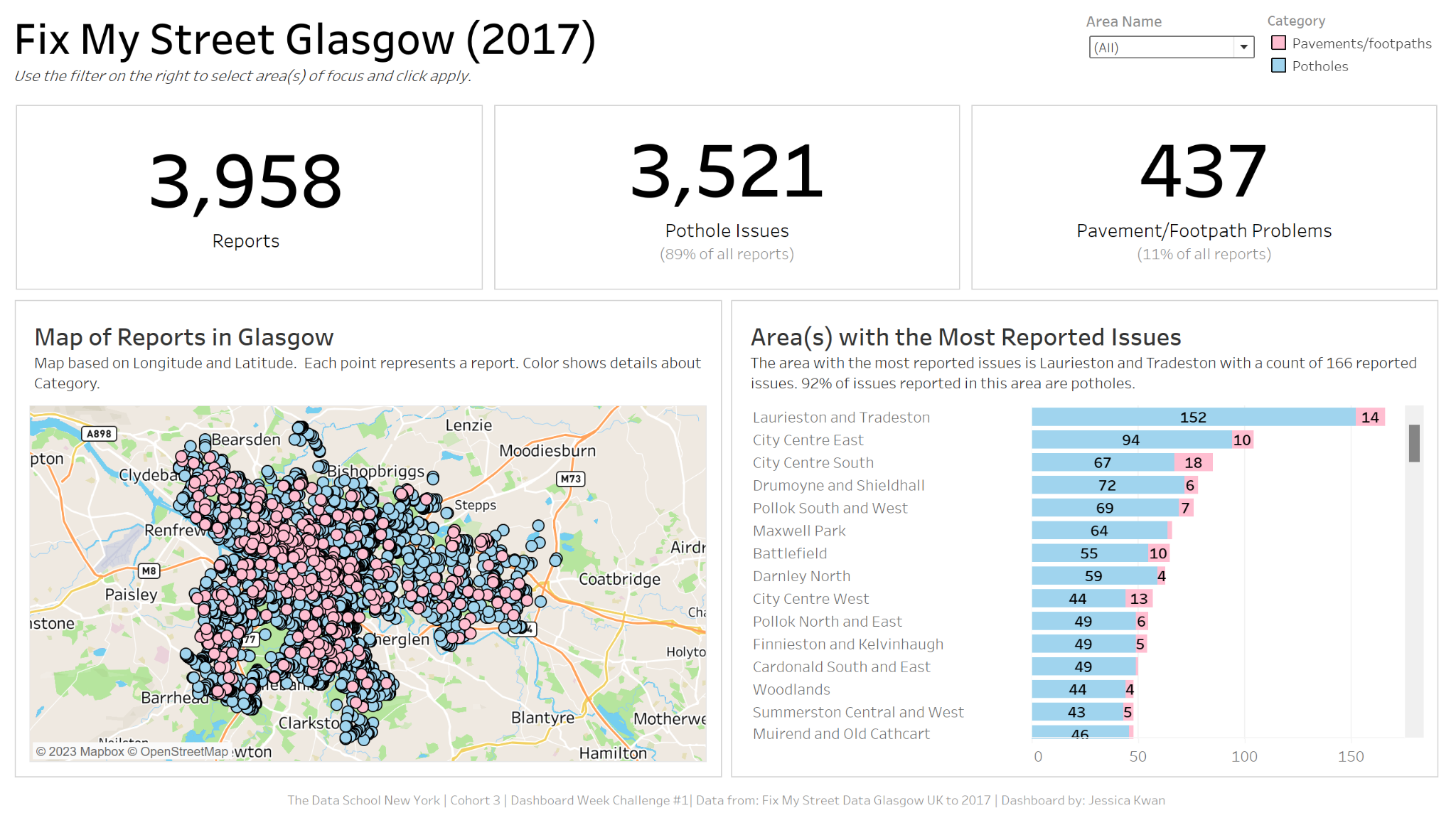 Hope you like the dashboard and as always, I welcome any constructive suggestions on my dashboards. If you would like to interact with the dashboard yourself, here’s the link: https://public.tableau.com/app/profile/jessk/viz/JessicaKwan-FixMyStreetGlasgow2017-ImprovedVersion_16855354065840/Dashboard1