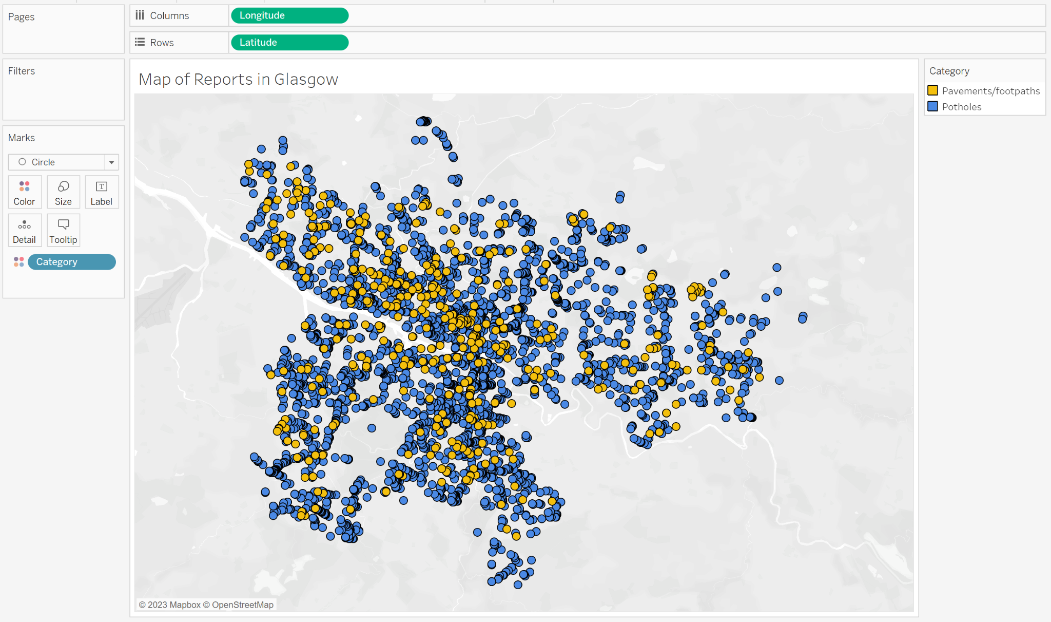 To make this map, I dragged and dropped Longitude to the Columns shelf and Latitude to the Rows Shelf. A base map will then populate the view. I then changed the marks to circles to mark each point that was reported to have an issue. I dragged Category onto color so that users would be able to differentiate between pothole issue reports and pavement/footpath issue reports: