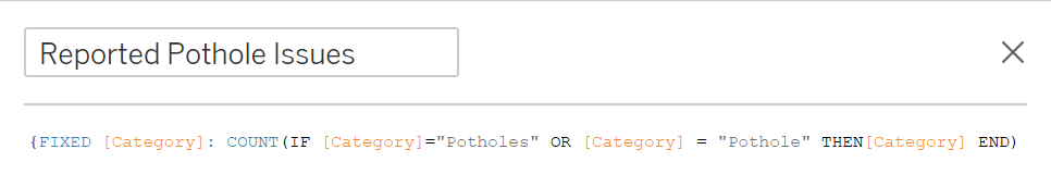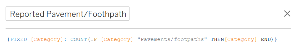 Then to get the two additional BANs, I needed to use a FIXED LOD to get the number of pothole issues reported and number of pavement/footpath issues reported.