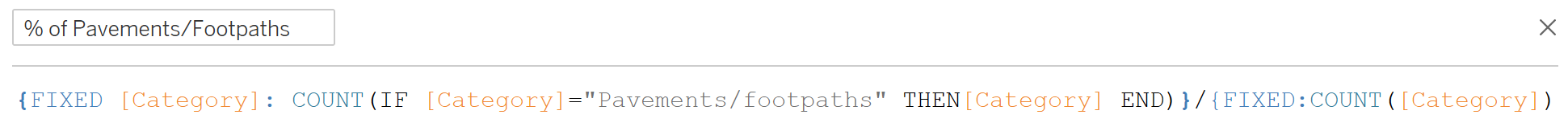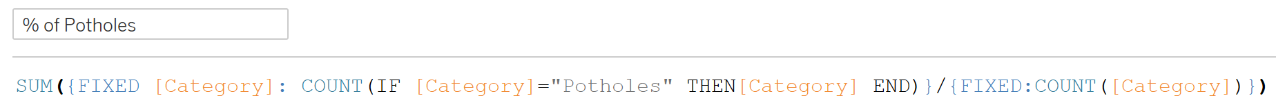 I also wanted to give users a bit of additional context so I decided to find the percentage of reported issues for each category. In other words, what percentage of all issues reported are pothole issues? What percentage of all issues reported are pavement/footpath issues? That required additional calculated fields: