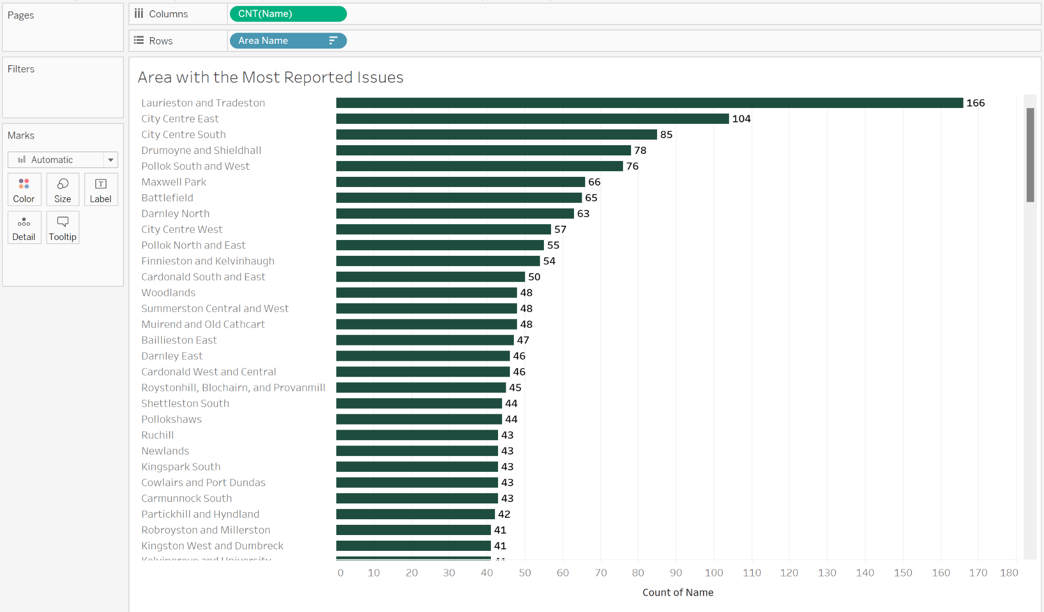 From there I moved on to making the bar chart to determine the area with the most reported issues. But before I could do that, I would need to extract the area name from the field Name. For example: Anniesland East - 01 should be Anniesland East, Maxwell Park - 01 should just be Maxwell Park, and so on and so forth. Luckily for us, we could just split by “-” and get the area name using this calculation: