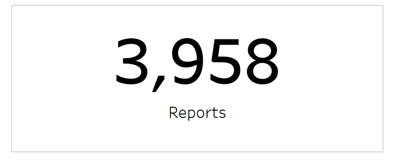 To get the BAN for total reports made, I just created right-click dragged and dropped the Name field onto Text in the Marks Card to get the COUNT of Names. In this case, a value in the Name column would be the Area Name combined with the Number of the Report so for example: