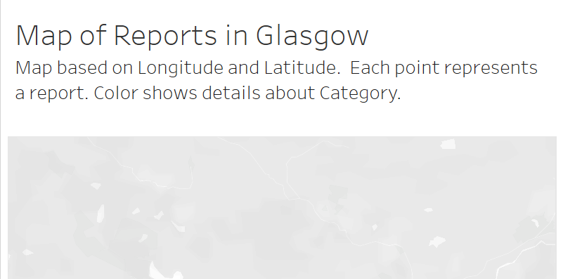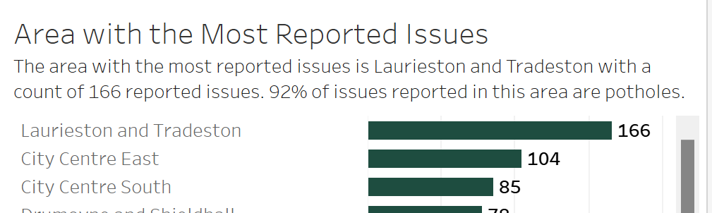Now, today’s goal was to make a dashboard that a screen reader could process and still make sense. So to accommodate those with visual impairments, but also just for best practice, I included captions in the title to explain the map: “Map based on Longitude and Latitude. Each point represents a report. Color shows details about Category.” I did the same for the bar chart: “The area with the most reported issues is Laurieston and Tradeston with a count of 166 reported issues. 92% of issues reported in this area are potholes.” Putting the caption within the title instead of putting it as an actual caption was due to the fact that members of the cohort realized that the screen reader had inconsistent performance when reading the captions, meaning that the screen reader itself sometimes had trouble processing the text. The best workaround was to put the text in the title itself, but as smaller text.