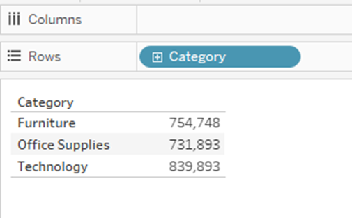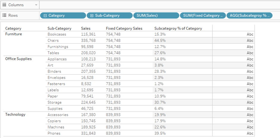 But what if we still want to see the category sales figures and even create a calculation with it e.g. show the percentage of each subcategory that makes up the category sales. This is where a FIXED LOD Expression will be needed.