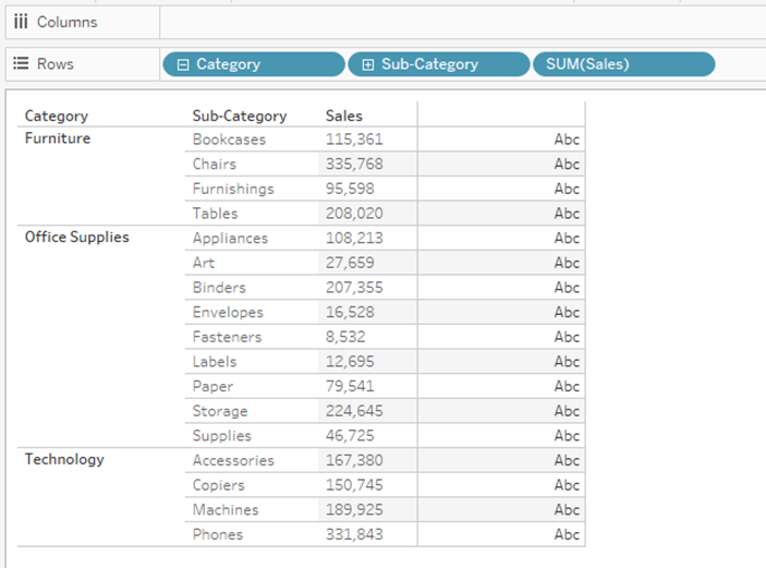 If we then drag this new field into view we can now see the category sales as well as the subcategory sales.
