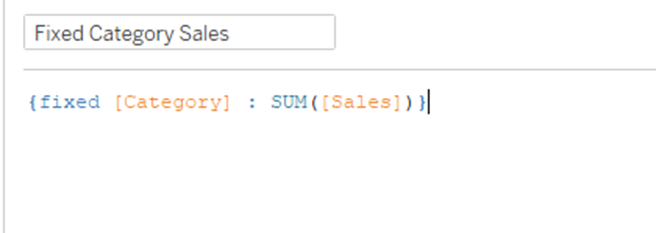 Fixed LODs in Tableau desktop are created using a calculated field and we use the following syntax to create our Fixed Category Sales data.