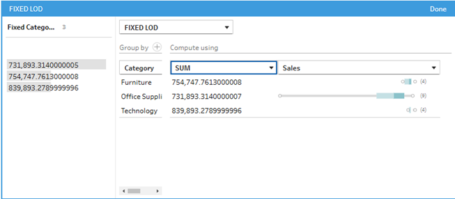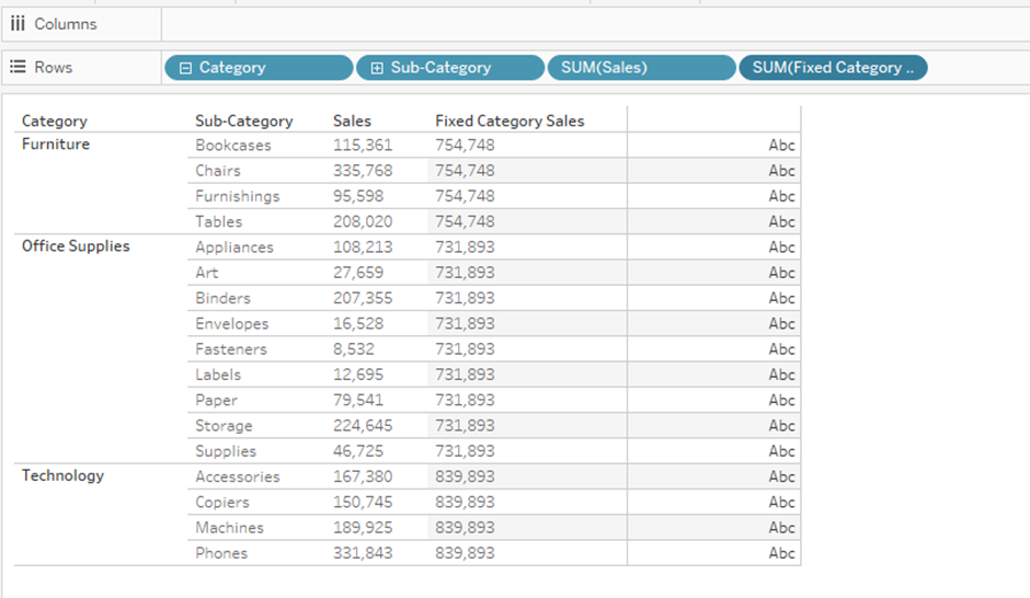 This tells Tableau to fix the level of detail on the category dimensions, and sum the sales values.