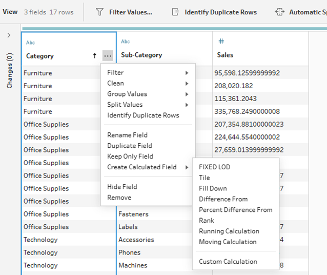 While Method 1 is effective, it seems a little convoluted, and thankfully Tableau Prep has a built in Fixed LOD calculated field function that will streamline the process. Simply click on the ellipsis menu of the field you want to fix, select the FIXED LOD option from the Create Calculated Field menu.