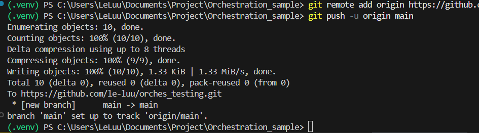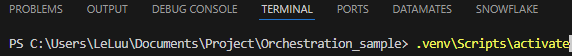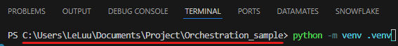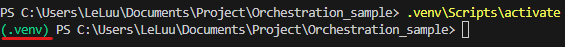 First, I will install the virtual environment in my project folder. I created a project folder called "Orchestration_sample", then change your directory in the terminal to access that folder. After that, I installed the virtual environment to run the script in the terminal: