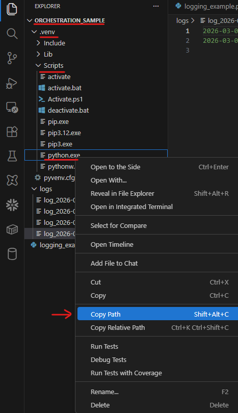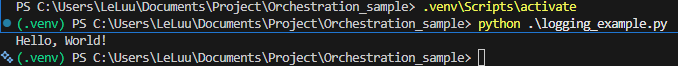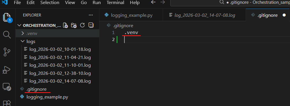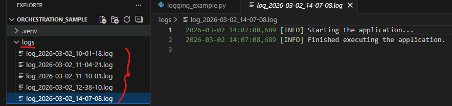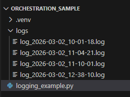In the Orchestration_sample folder, you will see that it created a logs folder. Inside that logs folder, it creates a .log file with the file name in the format <logs_timestamp>.log