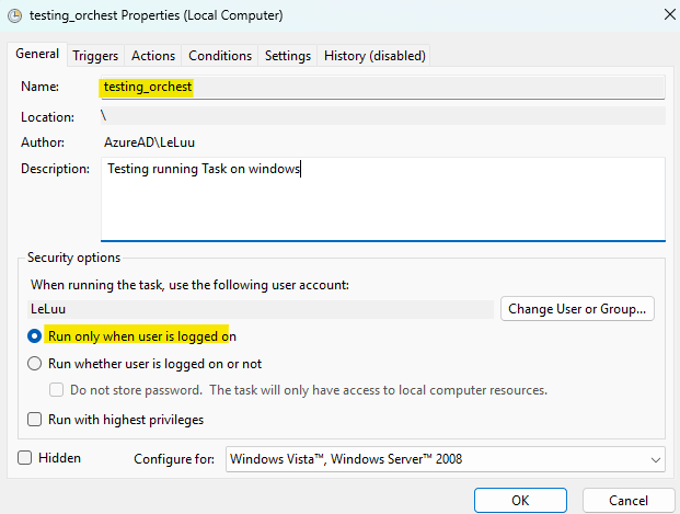 On the right panel (Actions), click on the Create Task menu. On the General tab, type the name of the task (For example: I type testing_orchest). For security options, I choose Run only when user is logged on. You can also choose the option "Run whether user is logged on or not".