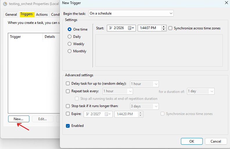 Then, click on OK. Go back to the Triggers tab to set the time closed to your current time and wait for the local computer to run the task.