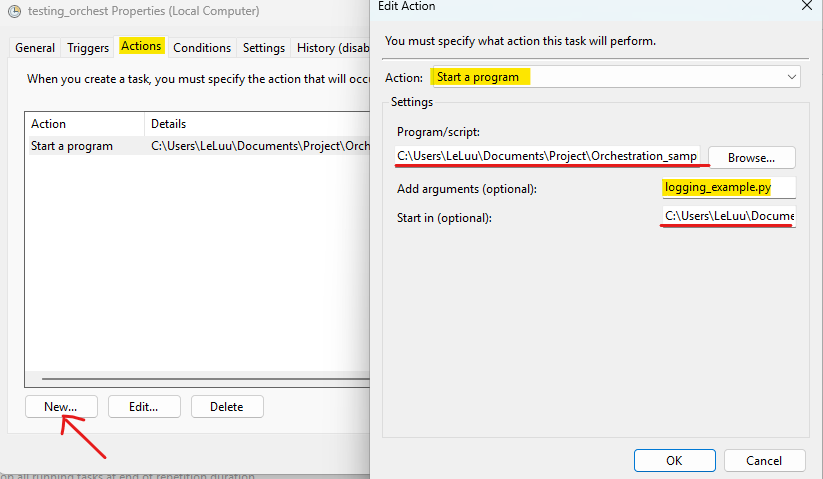 In the Add Arguments (optionals) box (Fig. 11), I type the name of the Python file. My Python file name is logging_example.py. In the Start in (optional) box, I copy and paste the Orchestration_example folder path to that place.