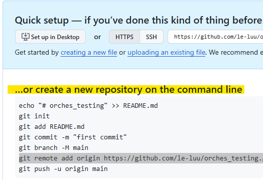 Then, I follow the instruction steps on the GitHub page (Fig. 16). First, I will initialize git on my directory with git init command. Then, add all files into staging with git add . command. Commit with the message after adding staging files with git commit -m "<message>". Then, rename the main branch with git branch -M main and connect the local repo with the remote repo at https://github.com/<user_name>/...git