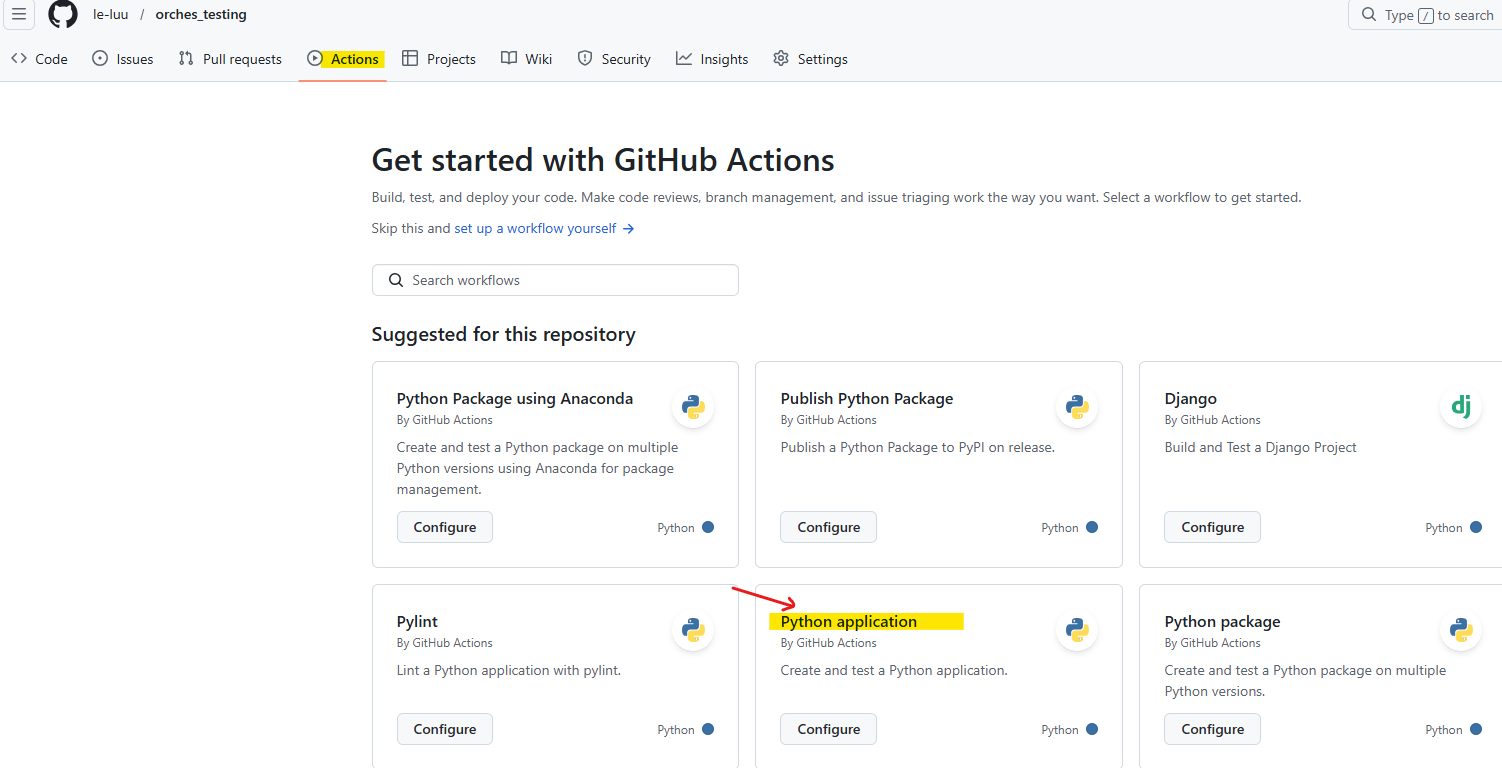 Cool! All files from my local machine were there. Now, I want to schedule a task to run it on this main branch. On the same repo page, at the top, you will see the Actions tab. Click on the Actions tab and choose Python application by clicking on Configure button.